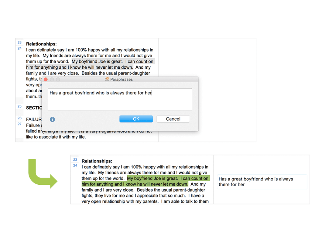 Conveniently summarize individual sections of data and display them directly next to the text. The brand new “Categorize Paraphrases” overview function is ideal for inductively forming new categories, which can help you create a new code system.