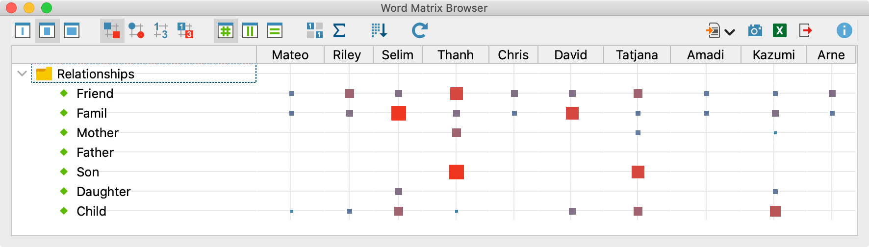Als Excel-Tabelle öffnen – Exportiert und öffnet die vollständige Matrix mit den Häufigkeiten als Excel-Datei. Die Zeilen und Spalten werden dabei vertauscht, um einen einfachen Import in SPSS und andere Statistikprogramme zu ermöglichen.