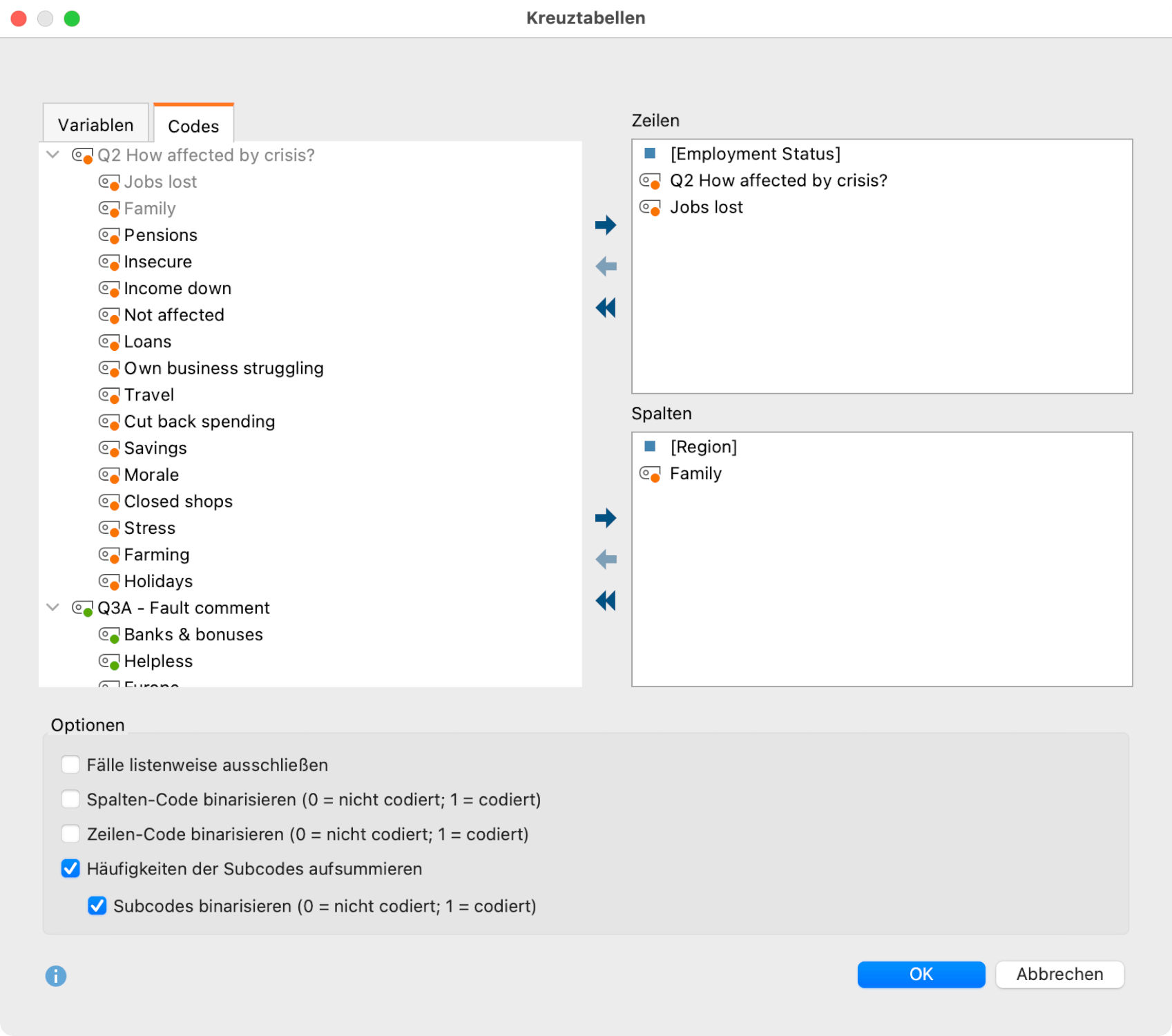 Um eine Kreuztabelle zu erstellen, wählen Sie im Hauptmenü von MAXQDA Stats die Funktion Gruppenvergleiche > Kreuztabellen. Im erscheinenden Dialog können Sie dann die Zeilen und Spalten der Kreuztabelle festlegen: