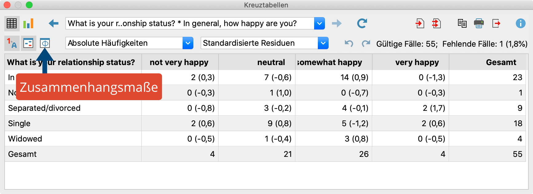 Um Zusammenhangsmaße und Chi-Quadrat-Werte für eine Kreuztabelle berechnen zu lassen, klicken Sie auf Symbol Zusammenhangsmaße
