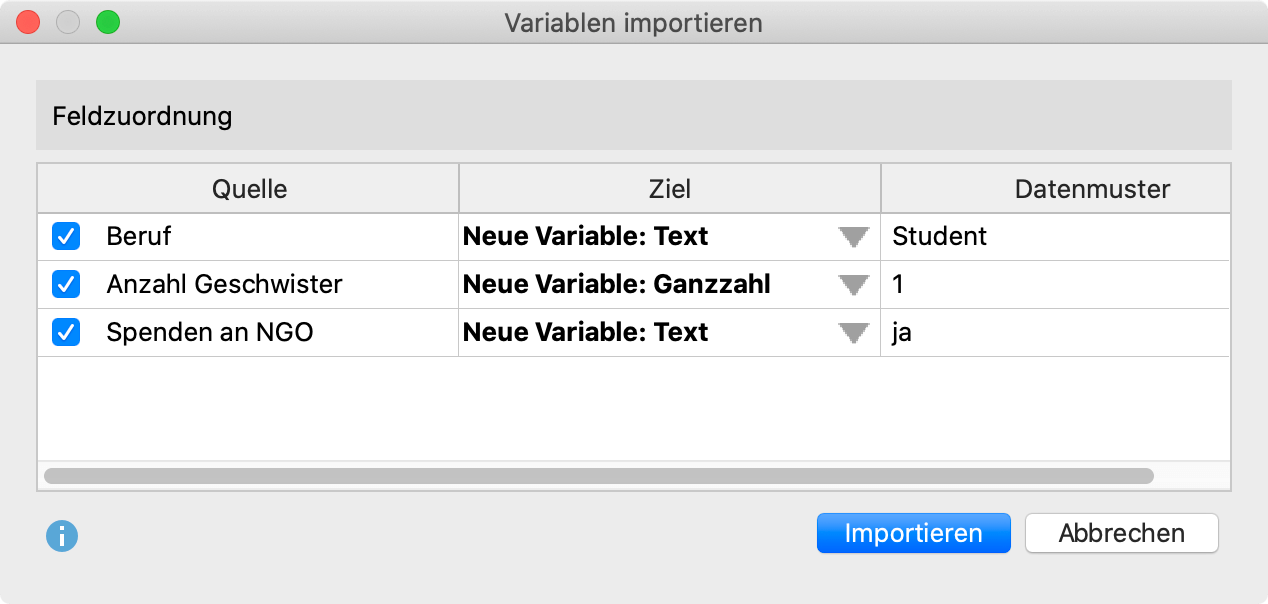 Nur wenn ein mit diesen Angaben genau übereinstimmender Code in der „Liste der Codes“ gefunden wird, erfolgt ein Variablenimport. In den weiteren Spalten können so viele Variablenspalten wie benötigt angefügt werden.