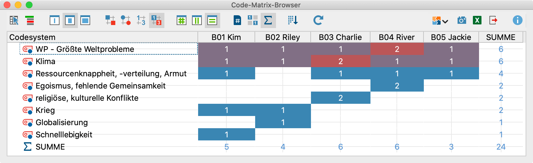 Bei Dokumenten in den Spalten wird hier der Name des Dokuments, der Name des Codes bzw. Subcodes und die Anzahl der hierfür vorhandenen codierten Segmente angezeigt. Wenn die Option Treffer pro Dokumente nur einmal zählen gewählt ist, steht hinter der für die Visualisierung berücksichtigten Anzahl in Klammern zusätzlich die tatsächliche Anzahl an Codierungen für den Knotenpunkt. Im obigen Beispiel bedeutet „1(2)“, dass 1 Codierung für Klima in der Spalte mit dem Dokument „B03 Sarah“ angezeigt wird, aber tatsächlich in dem Dokument 2 Codierungen vorkommen.