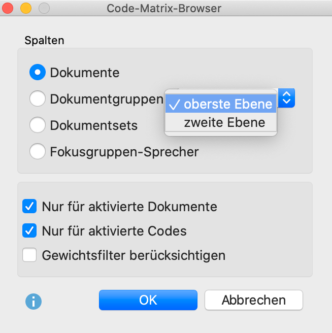 Dokumentgruppen – In den Spalten werden Dokumentgruppen dargestellt. Die Codierungen der einzelnen Dokumente der jeweiligen Dokumentgruppe werden aufsummiert. Bei Wahl der Option „oberste Ebene“ werden in den Spalten alle Dokumentgruppen dargestellt, die sich in der „Liste der Dokumente“ auf der obersten Ebene befinden. Die Dokumente aus Dokumentgruppen auf der zweiten Ebene werden den Dokumentgruppen auf der obersten Ebene hinzugerechnet. Bei Wahl der Option „zweite Ebene“ werden nur die Dokumentgruppen als Spalten visualisiert, die sich in einer anderen Dokumentgruppe befinden.