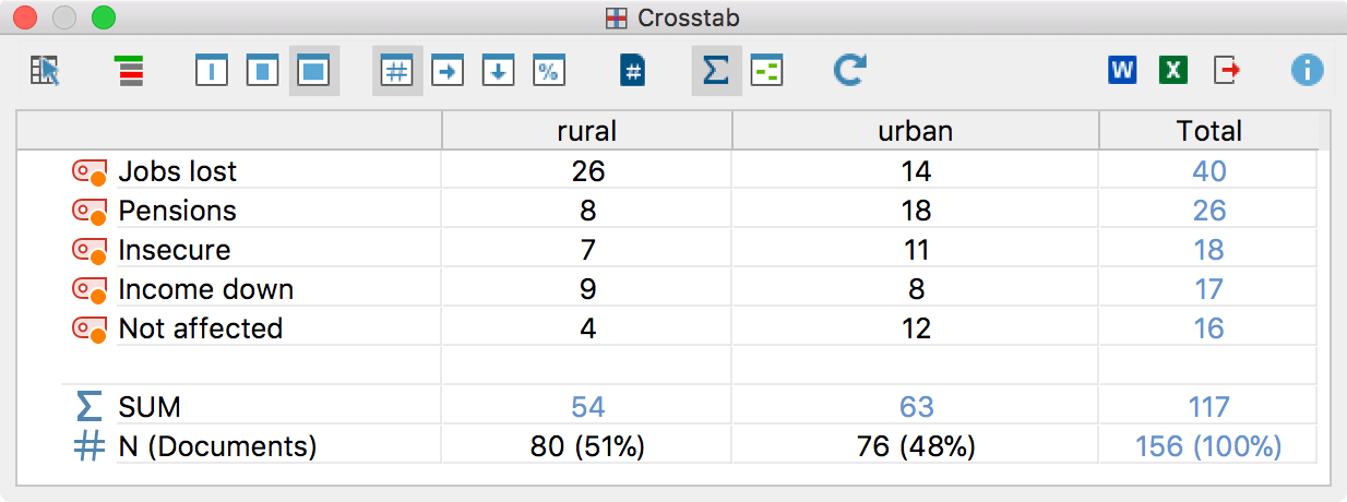 Crosstab is a visualization of the relationship between document variables and codes. The following example displays the number of times each code occurred in interviews in rural and interviews in urban areas.