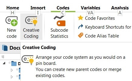 Note: If a large number of imported codes are involved or no large-format monitor is available, the creative coding window can become too cluttered to be used effectively. A less intuitive (or enjoyable) method is to undock and maximize the code system panel and to use the activation and “move activated codes here” functions to move codes in bulk. Adding, moving, linking codes as subcodes, and renaming codes is still possible using the code system view, but it may be less intuitive and slower than Creative Coding.