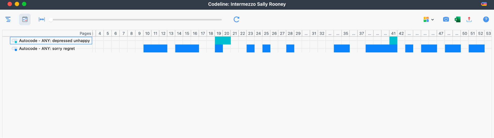 The MAXQDA Codeline offers a fast and comprehensive view of the codes assigned to a document. It displays a sequential view of a document’s coded segments allowing you to see at a glance in which sections of your document certain codes (i.e. topics) arise and in which not. In the example above, it becomes clear that the words „sorry/regret“ occur much more often than „depressed/unhappy“ and that both topics do not occur in the beginning of the book Intermezzo. To learn more, visit the Online Manual.