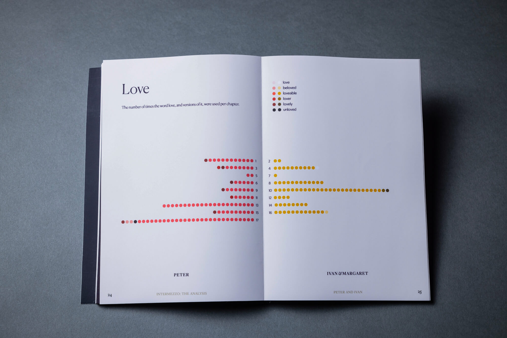 I used a variety of tools when creating the data visualizations in Intermezzo: The Analysis. The most important was the coding tool. I coded the sections of the book by chapter and character POV. This helped me organize the data points I collected and gave me the structure I used in the visuals throughout the book.