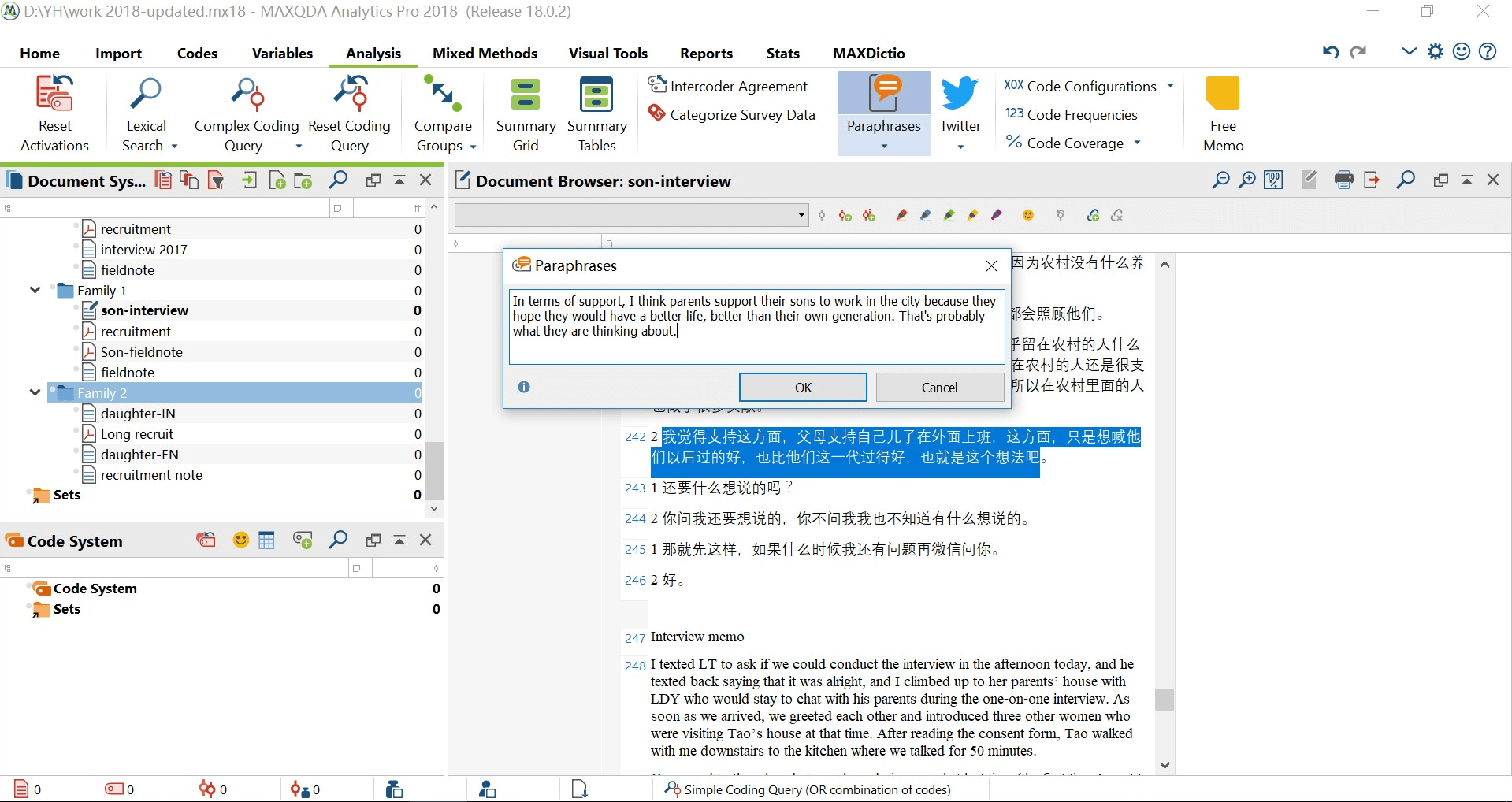 Alongside my variable-creation and memo-writing strategies, I have also used MAXQDA’s new paraphrasing function while reading through the interview transcripts in Chinese. I paraphrased research participants’ sentences and opinions into broad topics that they talked about, and then I generated a very preliminary set of codes to identify the main topics being talked about. Whenever there are interesting quotes in Chinese, I translated them into English using the paraphrasing function.