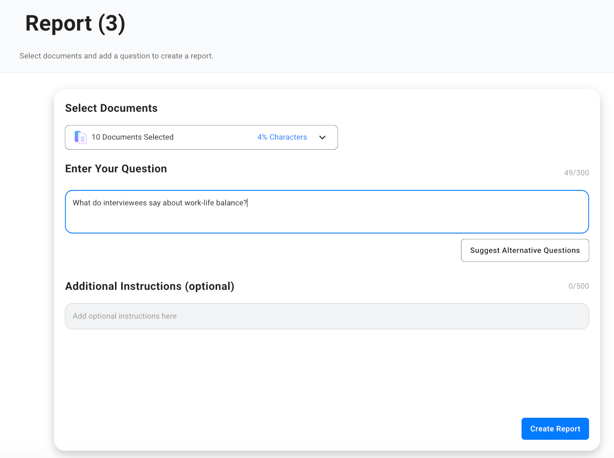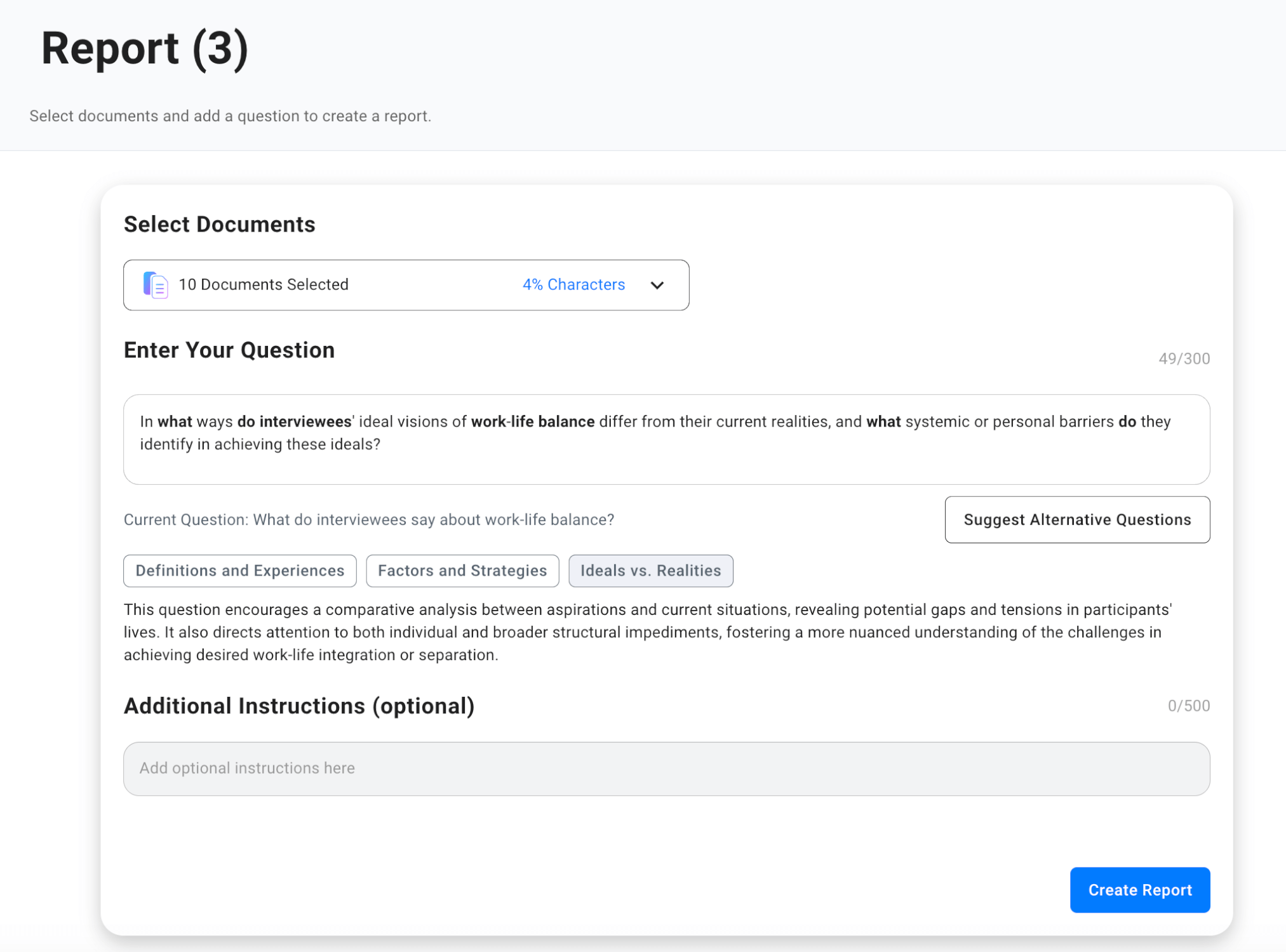 Im Beispiel unten möchten wir 10 Interviews zum Thema Work-Life-Balance untersuchen und haben zunächst die relativ unspezifische Frage „Was sagen die Interviewten zum Thema Work-Life Balance?“ verwendet und uns alternative Fragen vorschlagen lassen. In diesem Fall spezifizieren die vorgeschlagenen Fragen die Ausgangsfrage, indem Sie die Analyse auf bestimmte Aspekte fokussieren. Beispielsweise bezieht sich der Vorschlag „Definitions and Experiences“ darauf wie die Interviewten Work-Life Balance definieren und erleben, wohingegen der Vorschlag „Factors and Strategies“ die Analyse der Einflussfaktoren und der angewendeten Strategien zur Erreichung einer ausgewogenen Work-Life Balance fokussiert. - Benutzerdefinierte Anweisungen hinzufügen (optional): Sie können zusätzliche Anweisungen hinzufügen, um die Berichtserstellung zu steuern, beispielsweise eine Struktur für den Bericht definieren, methodische Überlegungen hinzufügen usw. Dadurch können Sie den Bericht ganz leicht an Ihre Bedürfnisse anpassen.