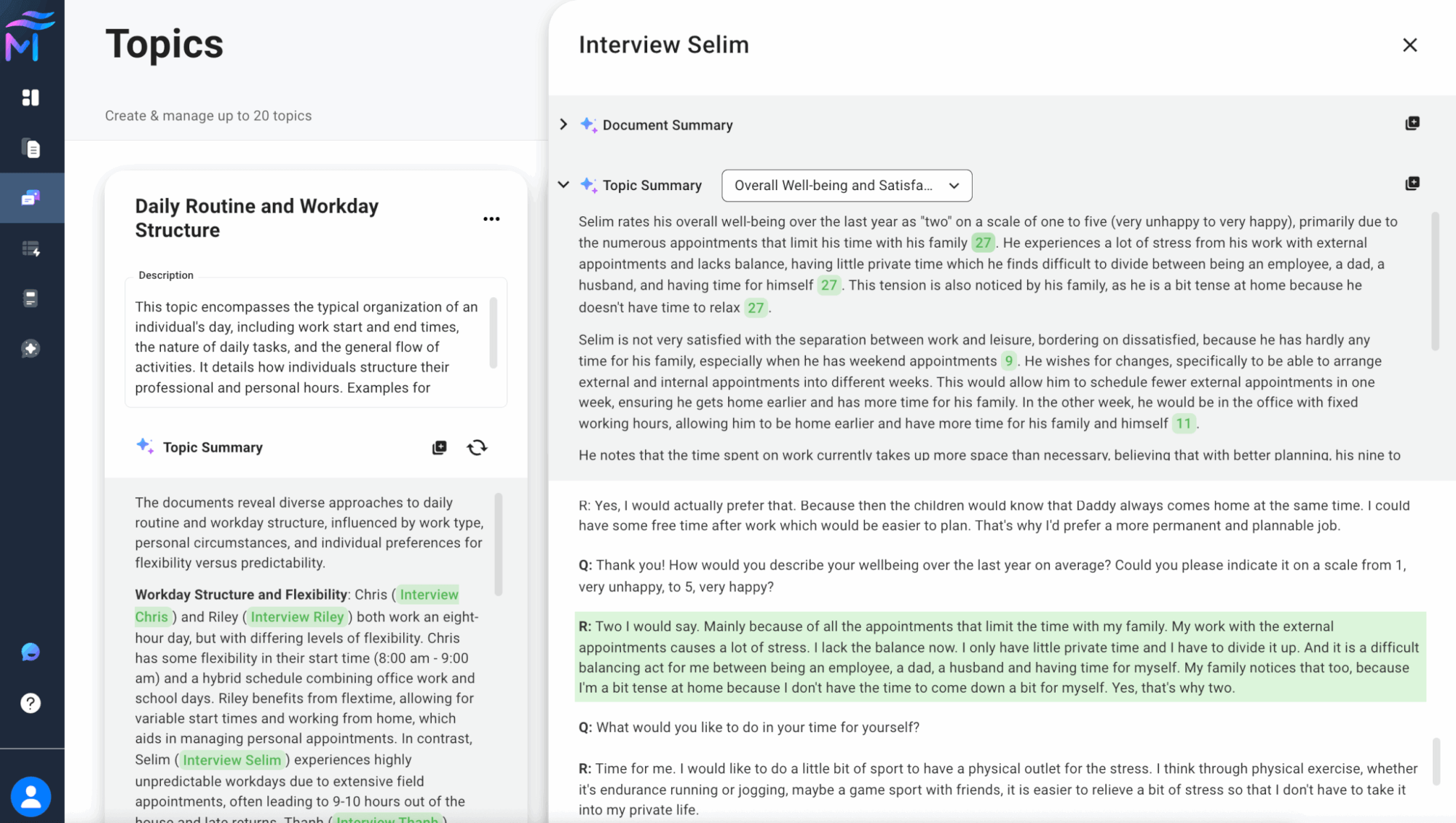 Das Dokument-Slideover beinhaltet nun zusätzlich zum ursprünglichen Text und der Dokumentzusammenfassung auch Topic-Dokument-Zusammenfassungen. Wählen Sie ein Topic aus, um eine Zusammenfassung des Topics in diesem Dokument zu erhalten. Ein Klick auf eine Referenz zeigt die Originaltextstelle an.