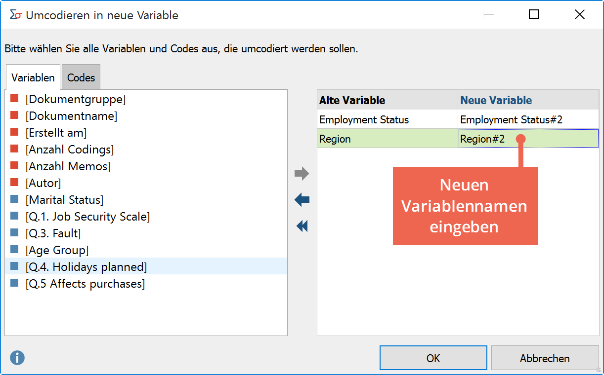 - Für die neuen Variablennamen schlägt MAXQDA Stats automatisch den bisherigen Namen ergänzt um eine Zahl hinter einer Raute # vor. Sie können den Namen durch Editieren der Zelle ändern.