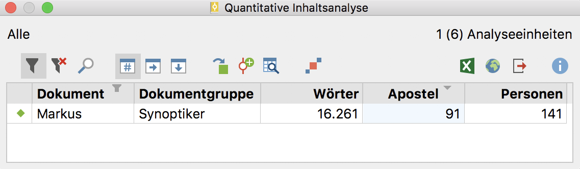 Wenn man im Auswahlfenster nur „Kapitel 1“ und „Kapitel 2“ angeklickt hätte, würde die Ergebnistabelle für dieses Dokument nur aus zwei Zeilen bestehen, nämlich den ausgezählten Texteinheiten der beiden Kapitel 1 und 2 (im Beispiel des Markus-Evangeliums).