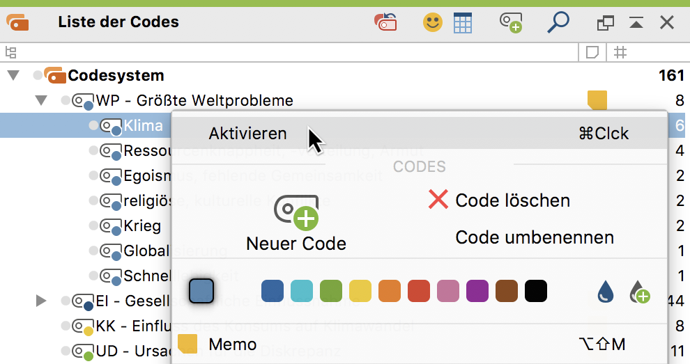 Die Aktivierung von Codes geschieht nach dem gleichen Prinzip. Entweder Sie klicken den gewünschten Code mit der rechten Maustaste an und wählen die Option Aktivieren aus dem Kontextmenü oder Sie arbeiten ebenso wie bei den Dokumenten mit der gedrückten Strg- bzw. cmd-Taste und klicken die Codes, die Sie aktivieren möchten, nacheinander mit der linken Maustaste an. Auch bei den Codes führt der einfache Mausklick auf den grauen Kreis vor dem Codesymbol oder die Codehäufigkeit zu einer Aktivierung.