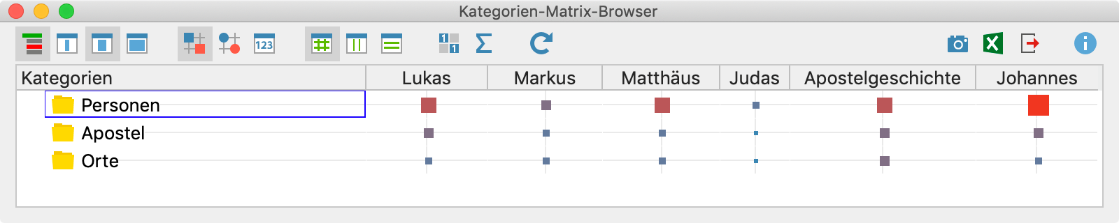 Die Knotenpunkte des Kategorien-Matrix-Browsers enthalten die Ergebnisse der Auszählung der Kategorienhäufigkeiten. Je größer ein Quadrat ist, desto mehr Fundstellen der Suchbegriffe der jeweiligen Diktionärskategorie wurden in dem betreffenden Dokument bzw. der Dokumentgruppe oder dem Dokumentset gefunden.