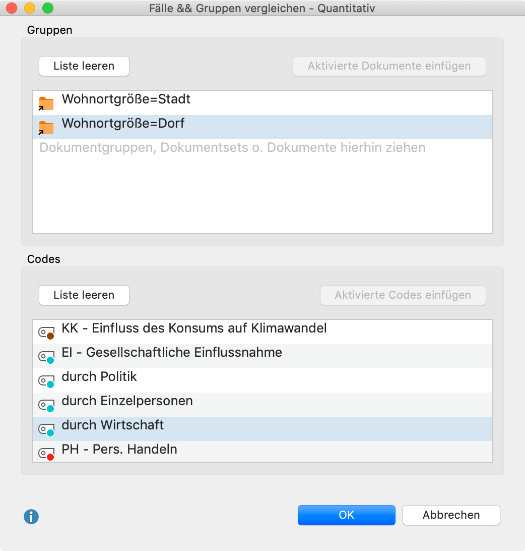Ein Gruppenvergleich für die Codehäufigkeiten wird folgendermaßen durchgeführt: