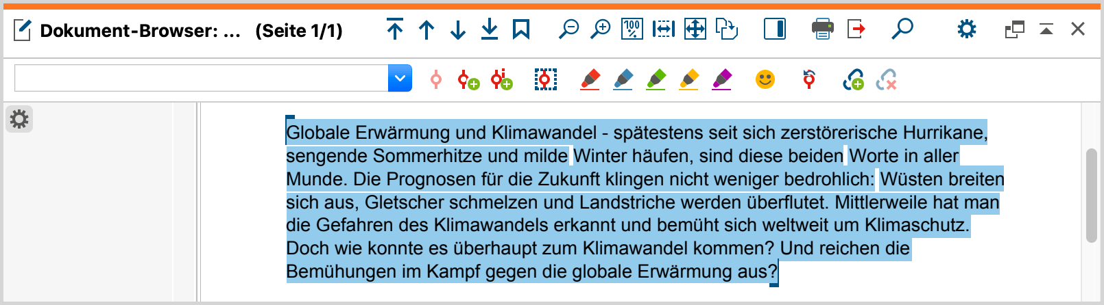 Das Codieren kann auf unterschiedliche Weise erfolgen, in jedem Fall muss zuerst im „Dokument-Browser“ der zu codierende Bereich, also eine Textpassage oder ein Bildausschnitt, mit der Maus ausgewählt werden. Damit ist beispielsweise folgende Ausgangssituation in einem Text geschaffen: