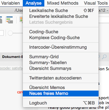 Freie Memos sind keinem spezifischen Bereich zugeordnet, sondern gelten für das ganze Projekt. Diese Art von Memos können Sie erstellen, um zum Beispiel Informationen zum Projekt insgesamt, wie etwa Forschungshypothesen oder zentrale Untersuchungsziele, zu hinterlegen. Freie Memos zu erstellen ist sehr einfach: