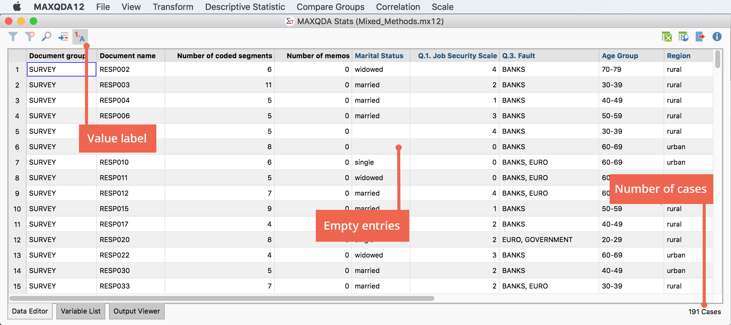 The MAXQDA Stats Data Editor displays the cases in the rows and the variables in the columns. Each case is therefore in a separate line. The following figure shows the Data Editor for a MAXQDA project, which essentially correponds to the Data Editor for the MAXQDA document variables. The first row provides information on the document “RESP002” which contains 6 coded segments and 0 memos. It refers to a survey respondent that is widowed, has a high job security level and is between 70 and 79 years old.