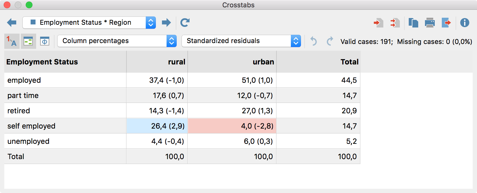 . Now MAXQDA Stats highlights all cells with a standardized residual greater than 2 in blue and all cells with values smaller than 2 in red. If there are values whose magnitude is greater than 2.6 the cells are additionally displayed in a darker colour.