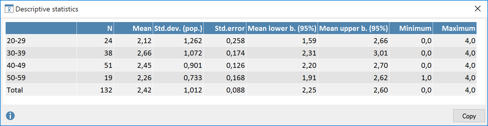 If you want to display important characteristic values for each factor level click on the icon Descriptive statistics