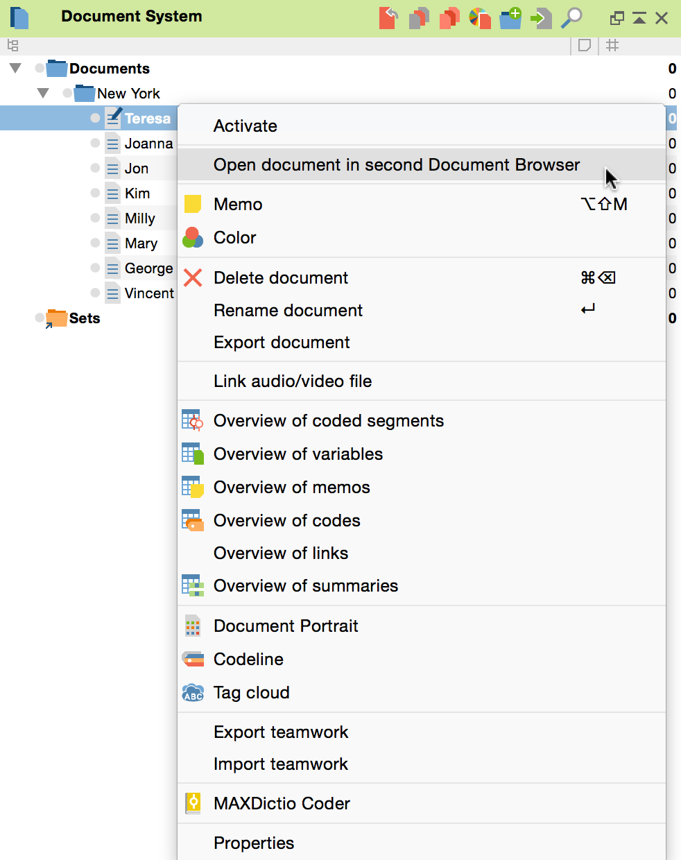 MAXQDA 12 offers the possibility of opening two documents simultaneously, each in in a separate document browser. This is helpful notably for conducting literature reviews: Open a publication as a PDF in one window and code thematically, directly from the document. You can simultaneously open and code a text document in which you have made your notes in the second window.