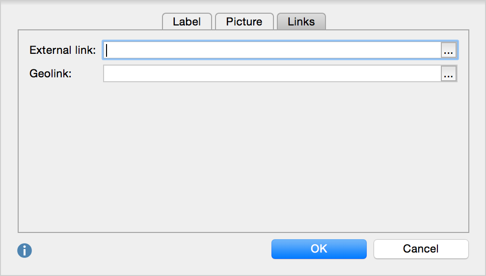 Geo Link: Insert a path to a .kml/.kmz file with geoinformation and it will be opened if you click on the object.