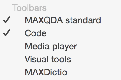 In addition to the main toolbar (”MAXQDA standard”), there are four other toolbars that can be shown or hidden as necessary. These toolbars can be hidden or displayed in the View menu.