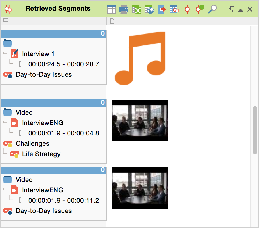 In the “Retrieved Segments” window, video clips are shown using the first picture of the video clip. For audio clips, a picture of a waveform is shown.
