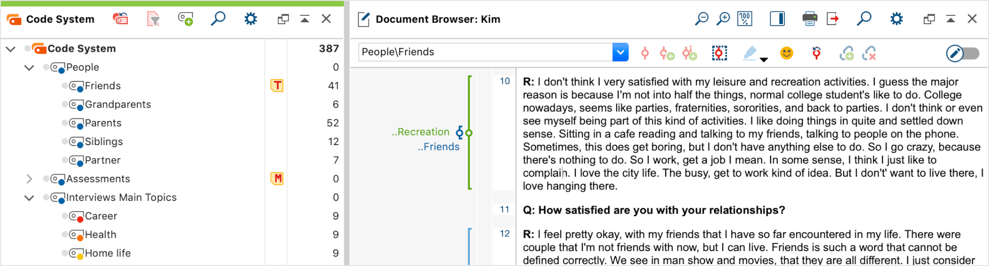 When coding a document, it is sometimes helpful to close the “Document System” and “Retrieved Segments” window, so the “Code System” and “Document Browser” are larger. The “Document Browser” can then be made even bigger by dragging the border in the direction of the “Code System”.