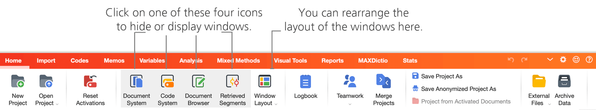 These tabs (some programs may call them “ribbons”) are located at the top of the MAXQDA window and offer access to many of MAXQDA’s features. On the “Home” tab you can open or close individual windows and arrange the screen according to the work you intend to do. On top of that, you can “undock” individual windows from the four-window structure and drag them to a different position or even a second computer screen. To open and close the windows, you can click on the button for the respective window(s), or simply close a window by clicking the “x” symbol in its upper right corner.