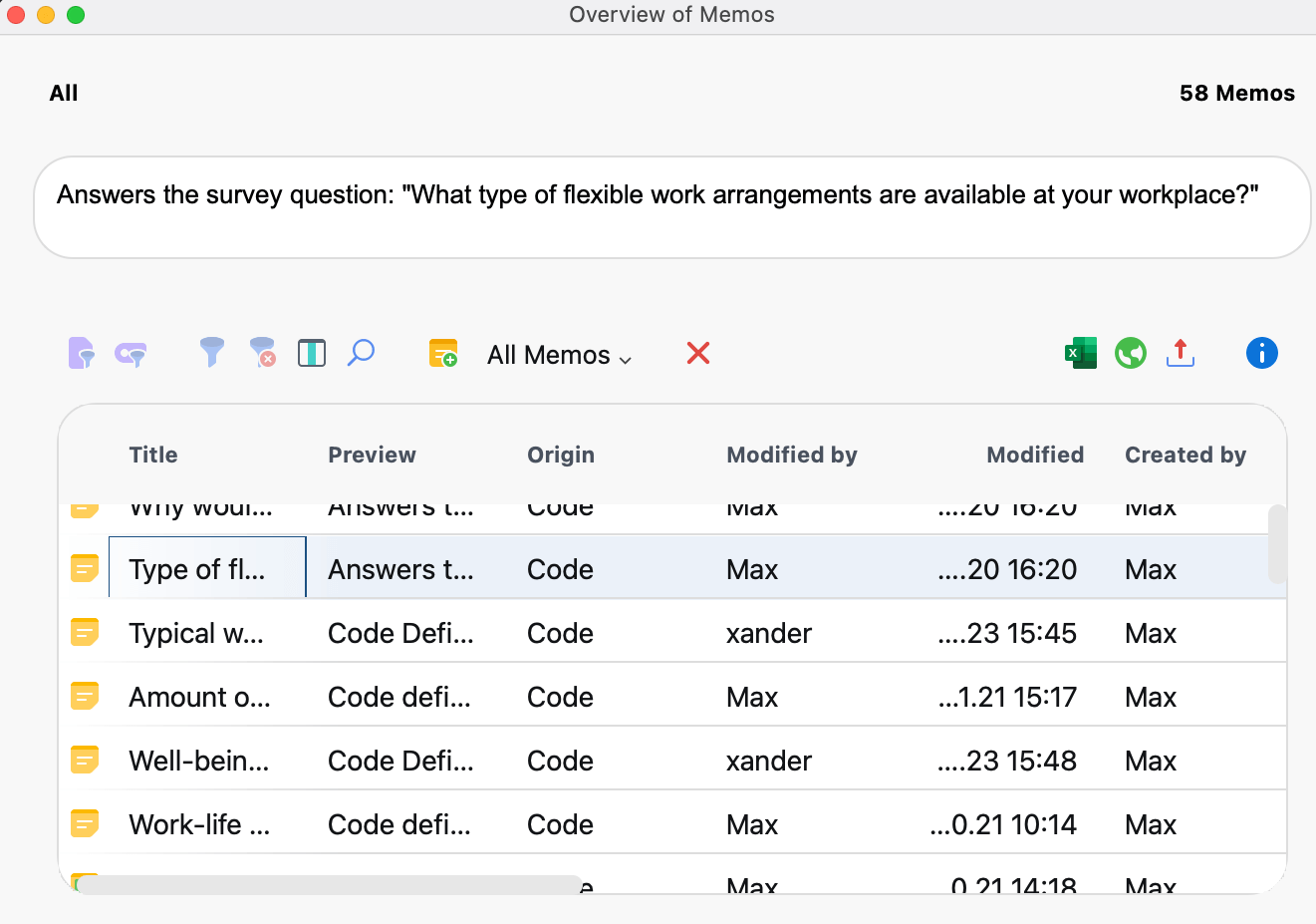Memos aren’t only accessible from their location next to documents, codes, document segments, etc. They are also available as an Overview of Memos. You can access these overviews in various ways.