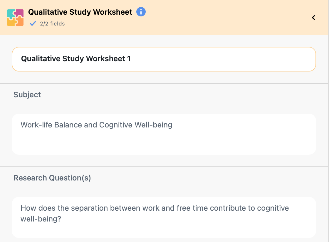 Qualitative Study Worksheets are designed to help you organize and synthesize findings from your qualitative research. They provide a focused space where you can collect coded segments, memos, visuals, and analysis results related to a specific topic or research question. Use these worksheets to explore themes, develop insights on your questions, and develop hypotheses and theories.