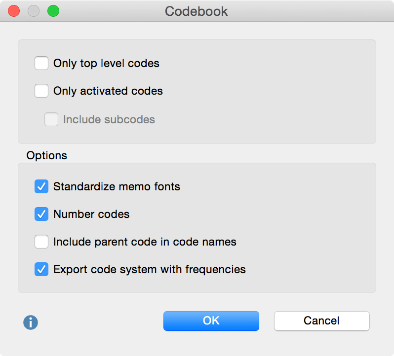 Select which codes should be included: All codes (that have a code-memo attached to them), only codes on the first level, or do you want to limit the codebook to just include activated codes? You also have some formatting options, like using the same font for all memos or to include code frequencies.