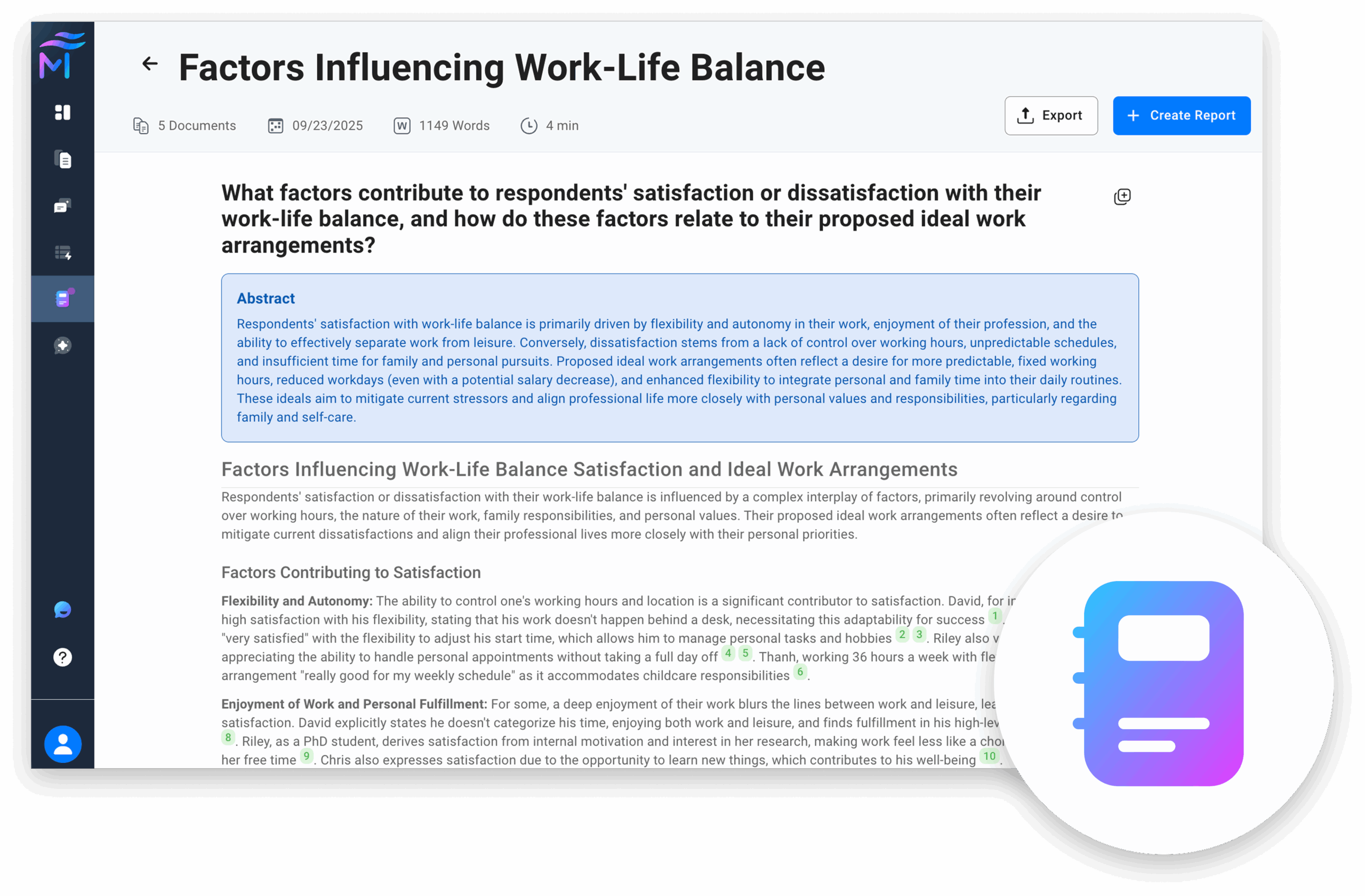 - Volle Transparenz: Interaktive Zitate verlinken jede Erkenntnis direkt mit dem Originaltext, damit Sie die Ergebnisse leicht überprüfen und den Kontext verstehen können.