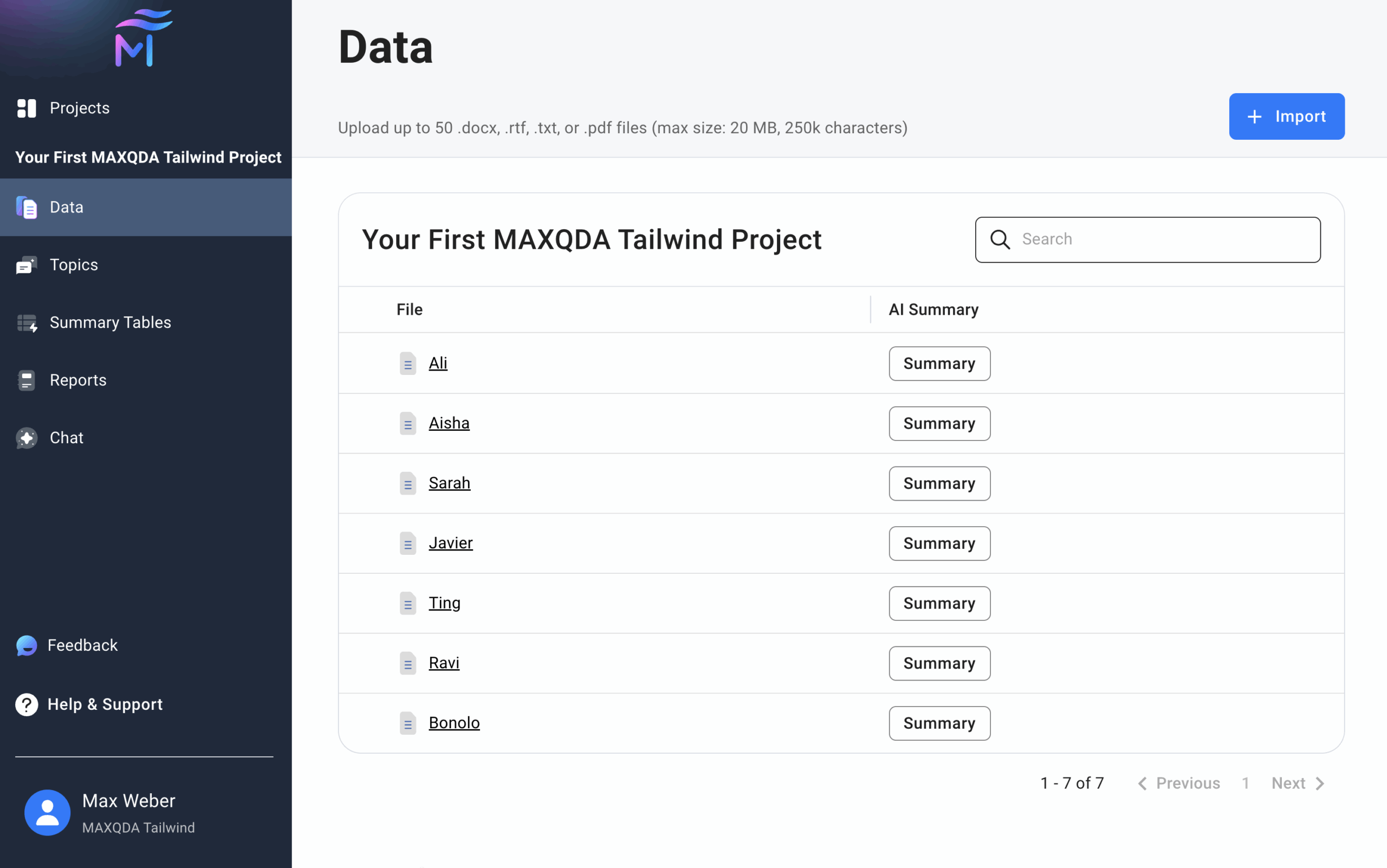 Data dashboard is your central hub for managing files in each MAXQDA Tailwind project. On this page, you’ll learn how to import, manage, and review your documents in MAXQDA Tailwind so you can start analyzing your data efficiently.