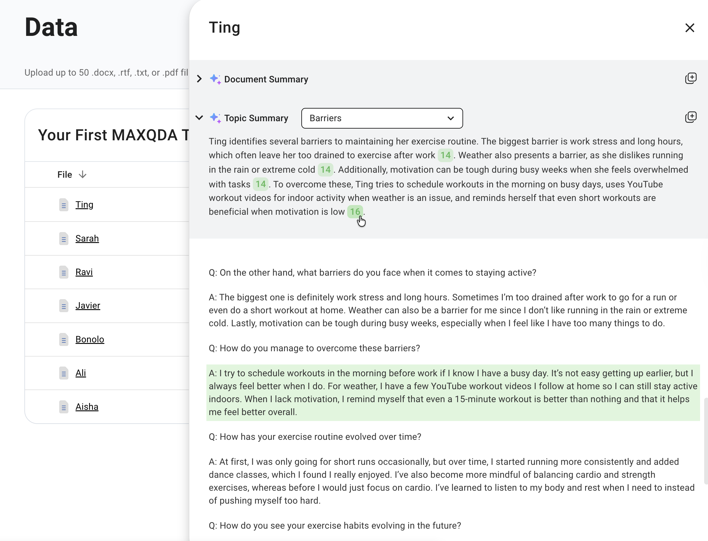 When you upload a text file, MAXQDA Tailwind generates an AI summary for it. To view the summary: