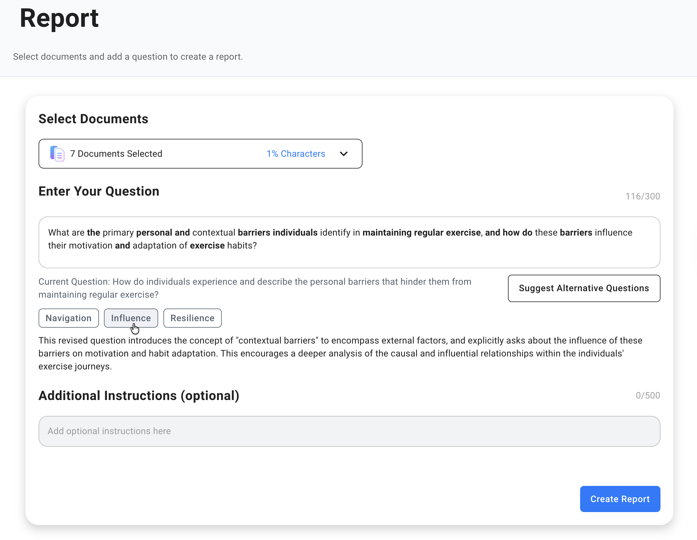 - (Optional) Click Suggest Alternative Questions to refine your research question.