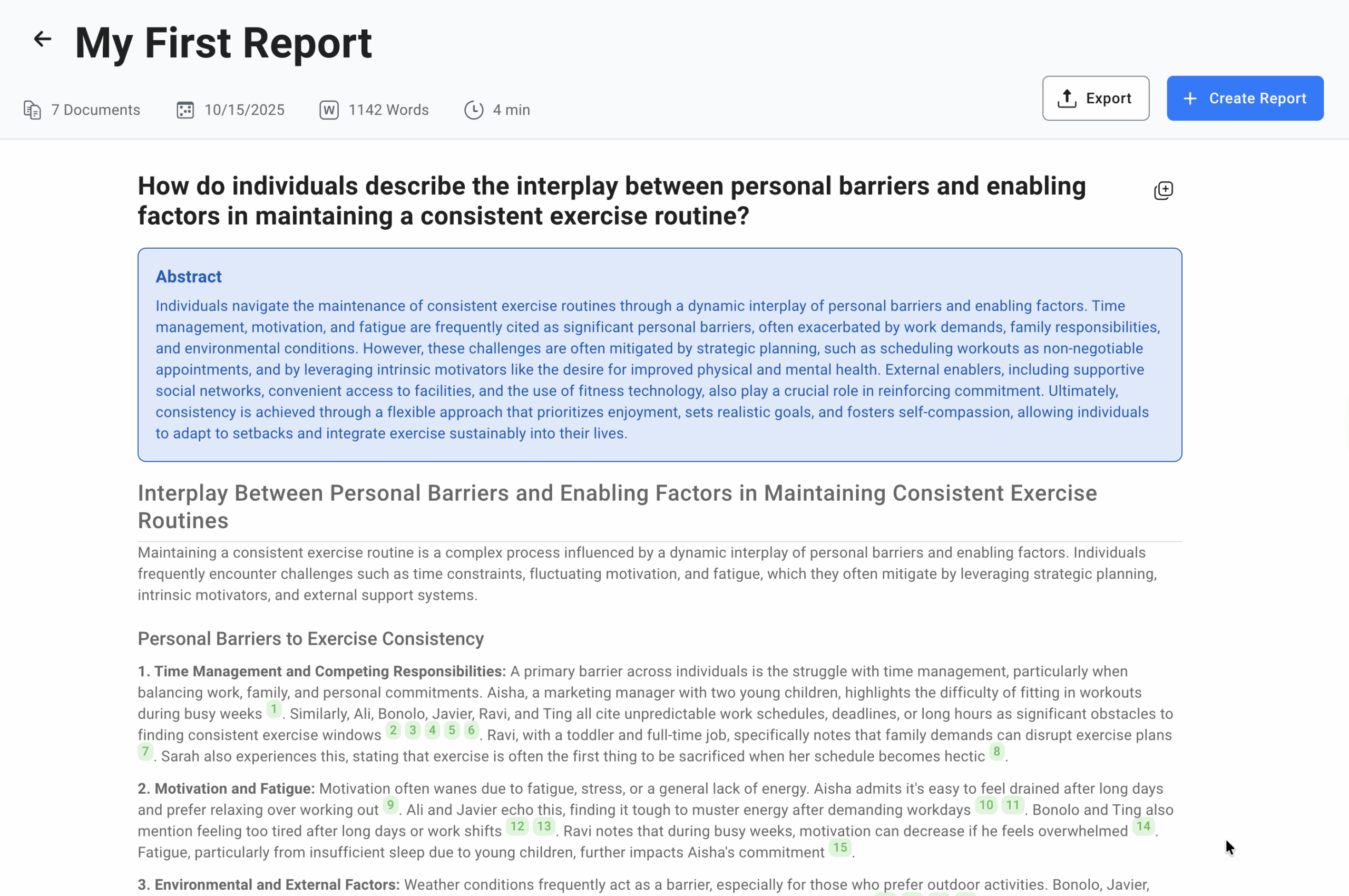 When generating reports, you may notice slight differences in the wording or phrasing if you re-run the same analysis with the same documents and question. This is intentional. Subtle variations help you explore different perspectives in your data while maintaining consistent core findings. - For those interested in generative AI