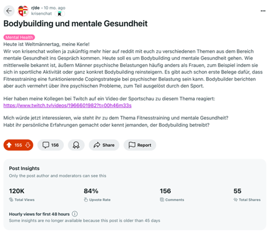 In my doctoral research I explore how men talk about mental health in online spaces, focusing on Reddit as a communicative environment that is thematically driven, anonymous, and shaped by community-based visibility metrics such as upvotes and comment threads. These discussions offer valuable insights into how topics like help-seeking, emotional strain or vulnerability are negotiated within male-coded online cultures. The goal of my project is to reconstruct how different user roles, discursive patterns and emotional framings manifest around psychoeducational content and to consider what this means for the development of future prevention strategies in digital contexts.