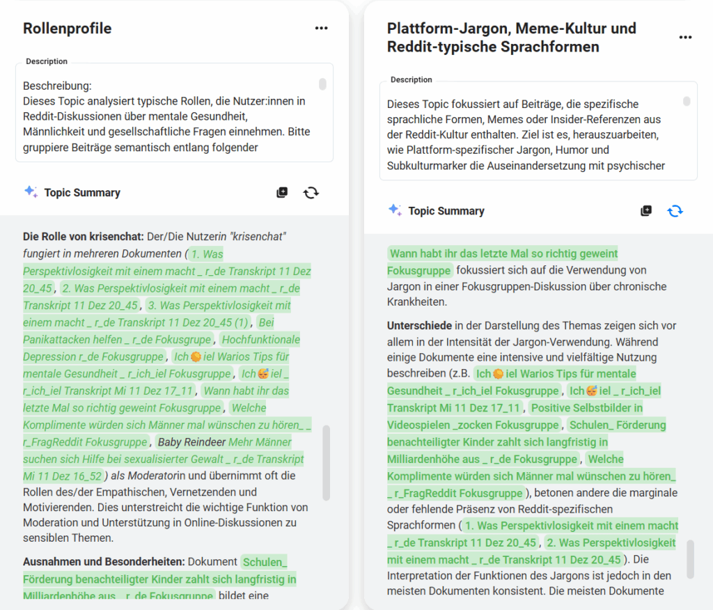 This is where MAXQDA Tailwind came in. Based on the coding structure developed in MAXQDA, I was able to reload all 18 Reddit documents into MAXQDA Tailwind and apply my categories across the dataset in one cohesive run. This made it possible to re-analyse the material using refined, topic-specific coding logic, but now with the benefit of semantic grouping and matrix-based output. The MAXQDA Tailwind chat function turned out to be especially helpful. It allowed me to ask precise questions about discourse dynamics, such as identifying which posts were emotionally supportive and received strong community feedback, or which roles appeared most frequently in controversial threads. I found the language understanding of the model surprisingly nuanced. Reddit-specific expressions, insider jokes and cultural codes such as irony or sarcasm were usually interpreted correctly. I rarely had to rephrase or explain what I was looking for, which speaks to the model’s contextual awareness.