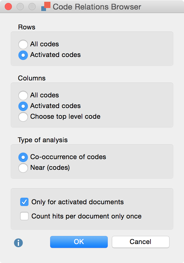 Count hits per document only once – The Code Relations Browser counts the number of documents in which an overlap or proximity (near) of codes exists. It does not matter how many times the overlap or proximity occurs within a document.